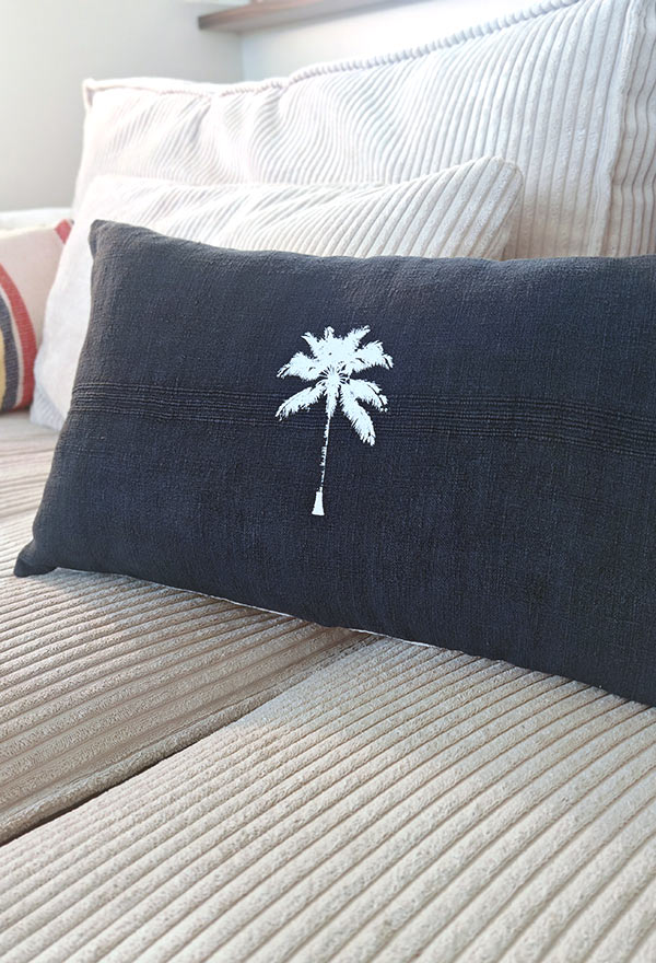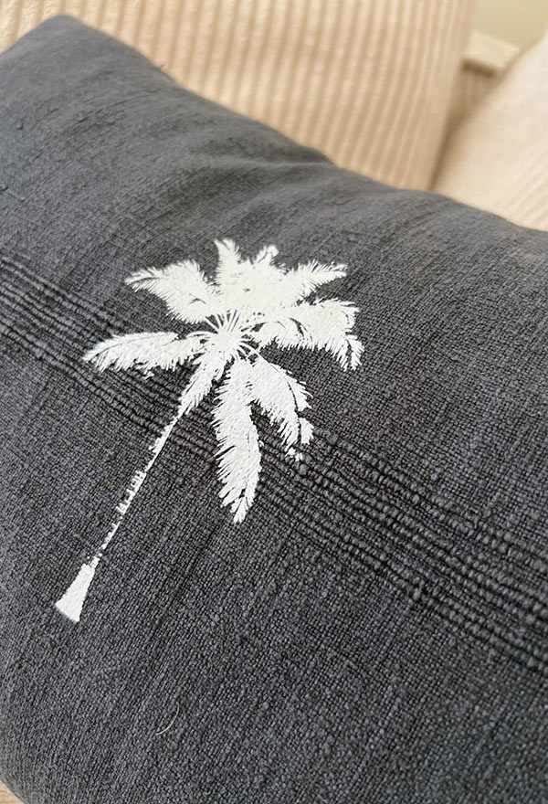 Ce coussin n’existe qu’en deux exemplaires. Confectionné dans un lin ancien, patiemment chiné, il a été teint à la main dans un noir charbon, presque minéral. Une sérigraphie blanche en forme de palmier vient subtilement contraster l’ensemble, pour un esprit épuré et un brin poétique.