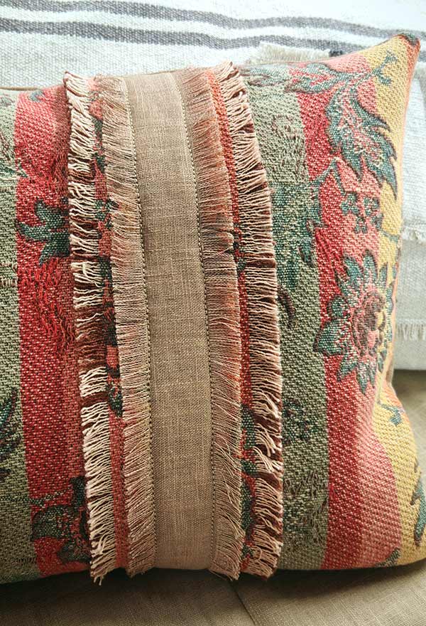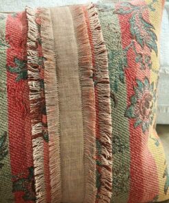 Issu d’un tissu ancien chiné, rare et singulier, il marie l’éclat des rayures colorées à la délicatesse des fleurs et des franges.